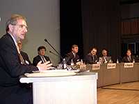 Bruno Lanvin, world coordinator of the UNCTAD Trade Point Program, presented five e-commerce issues, including free trade for market transparency, getting rid of the middleman, creating seamless global markets, small-time players threatening bigger competitors, and a virtual economy.